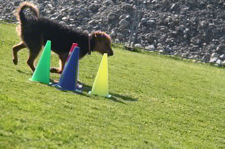 - Rennt der Hund zuverlässig um die Pylone, bauen Sie Ablenkungen um die Pylone oder vor ihr ein.