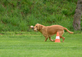 Mit Apportel im Fang um den Kegel rennen